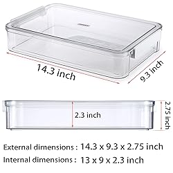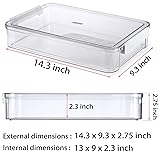 Versatile Storage Organizer: This paper organizer box can hold standard (8.5" X 11") a4 paper, files, documents, notebooks, crafts, and stationery and more, making it ideal for storing a variety of items at home, office, or school. Premium Quality and Size: This paper organizer is made of safe PET environmental material, strong and long lasting to use, set of 2 boxes. Single External size: 14.3"x9.4"x2.7"/ Inner size: 13.2"x8.7"x2.5" (LxWxH); The whole 2 Pack size: 14.3"x 9.4"x 5.3" (LxWxH). Transparent Organization: These plastic file boxes are designed with outstanding transparency, allowing easy and quick identification of items inside the box from any angle without opening the lid, maximizing time savings for you. Convenient Separate Lid & Stackable Design: The plastic storage box set features 2 separate lids for easy access to items, besides, the storagfe boxes are cleverly designed grooves on their lids, enhancing stacking stability. Multiple flat storage containers can be easily stacked together, efficiently optimizing your use of space. Snap-Tight Latches Design: Each document storage container with two sturdy closing latches is easy to access and can be closed tightly, well-sealed against dust and water, preventing loss and damage to important documents.