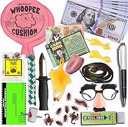 APRIL FOOLS PRANKS AND GAGS: - Get screamingly funny, hilariously awful, but scarily plausible pranks from several props, pranks, magic tricks, and jokes in our little prank gag pack. Select from the long list of prank items in the box to make good of every moment, and keep a straight face as you watch your friends and loved ones get pranked repeatedly from this set. 40 PIECE PRANK TOYS: - Flex your prank muscles with an inexhaustible chest of prank items. Our chest contains both classic and new prank items, such as fake bugs, stress squeezing chicken, shocking gum, shocking pen, fake poop, nail in the finger, children's vampire teeth, stretchy fake tongue, whoopie cushion fake snake and Halloween props. This makes it the ultimate prank kit anyone can get. PRANK STUFF and MORE PRANKS - Explore a whole set gags and gifts with our super realistic props that could even trick you. The 30 prank items will have everyone pranked and laughing at themselves once they realize that these were just props and it was all a prank. Your whole family would enjoy the reactions and the non-stop hour of laughter. Whoopie cushions for kids,pranks for adults, shock pen, shocking gum, its all here. ENDLESS LAUGHTER IN THIS PRANK BOX : - Add the gift of laughter to the party with this quirky and fun twist on the timeless tradition of fun gag. It will guarantee laughs for all! Great fun for any social gathering like parties, holidays, outings, and more. The gift pack is a great idea for April Fools' Day, Easter, Christmas, and some scary Halloween activities. EXCELLENT PRANK SET FOR KIDS 10 AND UP: - Every family wants a good time, but sparking those moments may be difficult. This hilarious prank pack makes the ultimate prank set for kids and fun-loving adults who have a great sense of humour. Perfect if you’re looking for stocking stuffers, party favours, pranks for adults, or a prank kit for adults UPDATED AND RUBBER WHOOPEE CUSHION - We hear your comments and made improvements, this prank kit now includes the updated and improved 8 inch rubber Whoopee Cushion. MAKES A LOUD POOT SOUND. Let 'em rip! Longer lasting fun!