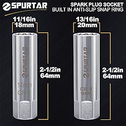 12-Point 14 mm spark plug socket +16mm Spark Plug Socket Thin Wall with Build-in Anti-Slip Spring retainer clip for easy spark plug removal Compatible with BMW M5 (F10), BMW 318 2007+ BMW 3.0L turbocharged engines such as the N54, N55, N20, N26, S55, N63, B46, B48, and B58; Certainly fit for BMW motorcycles and engines, fit for Cooper vehicles such as the R55, R56, R57, R60 Spurtar thin wall spark plug socket set made from chrome vanadium steel(CR-V) for higher durability, and resistance to corrosion Built-in special leaf spring retainer clip, this thin wall socket set can hold the spark plug firmly in the socket, with a superior grip, very easy to remove If you have any problems when using the spark plugs socket set, please feel free to contact us and enjoy 100% satisfied service from our team. Package includes 1 x 14mm spark plug socket + 1 x 16mm spark plug socket