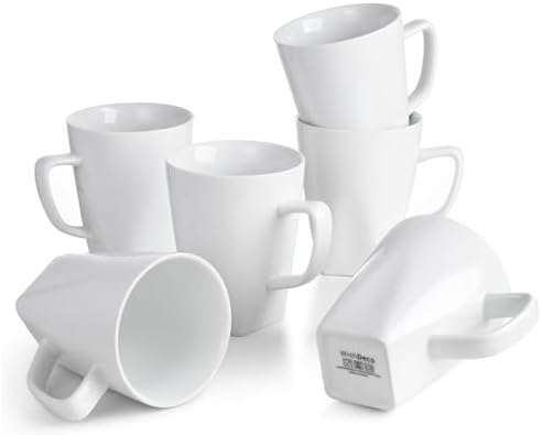 White Coffee Mugs Set of 6, Ceramic Coffee Cups 14 oz, Modern Tea Mugs, Porcelain Tea Cups, Large Mug for Latte, Cappuccino, Milk, Juice, Cocoa, Square Bottom, Microwave and Dishwasher Safe