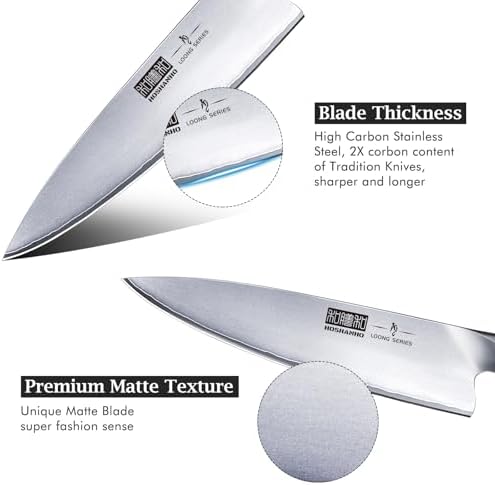 - 【Diseño moderno de hoja mate】La hoja tiene un acabado mate, la combinación de moda y durabilidad añade más diversión a tu cocina. Fabricados con tecnología moderna y técnicas tradicionales, están templados con hielo y tratados térmicamente para resistir el frío, el calor, la corrosión y la humedad.