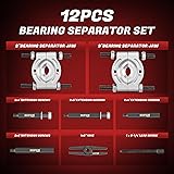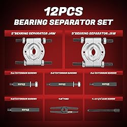 - PRODUCT INFORMATION:SKU:2131CRMODEL NAME: 12 in 1 Bearing Separator and Puller SetPRODUCT FEATURES:Bearing Separator and Puller Set includes:1-piece 2”(5 cm) bearing separator jaws or splitters1-piece 3” (7.6 cm)bearing separator jaws or splitters1-piece 6” (15.2cm)yoke1-piece 9/16’’pressure screw4-piece 4”&5”(10 &12.7 cm) hex push-pull legs 4-piece 4”&5”(10 &12.7 cm) hex extension legsHighly PracticalUp to 5-ton-capacityIncludes 2 most widely used bearing separator jaws (2 & 3 inches)Bearing separator jaws have large contact area with bearings, separate bearings and remove gears without damageHeavy duty 45 # carbon steel, high hardness and long service lifeIdeal for front and rear wheel axle hubs,gears, pinions, pulleys, drive shafts, and small or large center bearing seal removal on your cars or trucks.CAUTION:Do not use extension screws of different lengthsOvertighten Separator Jaw Nuts may damage bearings