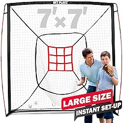 ULTIMATE TRAINING AID: Perfect for players of all abilities for batting practice, pitching, fielding, catching, and backstop use spend less time chasing balls and more time honing skills EASY QUICK SETUP: Durable fiberglass frame included, sets up in 90 seconds to huge 7 foot x 7 foot size with metal stakes to anchor the net, making it incredibly sturdy and stable; easily breaks down for transport. TRAIN ANYWHERE / ANYTIME - Great for outdoor and indoor use. Perfect for tee work, hitting, pitching, batting, fielding. Can be used for as a portable backstop. Perfect for training sessions. Great for any backyard, garage or on the field. Includes metal stakes to secure the net to grass or dirt infield.
