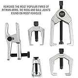 Versatile Suspension Tools: Perform essential front-end maintenance tasks with pitman arm puller, ball joint separator, and tie rod removal tools, making it easy to work on various suspension systems without damaging components. Heavy Duty Pitman Arm Puller: Tackle tough jobs with our heavy duty pitman arm puller, designed for durability and precision when removing stubborn pitman arms in heavy-duty applications, ensuring a smooth repair process. Comprehensive Ball Joint Kit: Safely remove and install ball joints with our ball joint puller and ball joint separator tool kit, suitable for a wide range of vehicles, helping you complete jobs faster and more effectively. Precise Tie Rod Tools: Utilize our tie rod tool and tierod separator to efficiently remove and replace tie rod ends without causing damage, ensuring a secure fit and maintaining vehicle alignment during front-end repairs. Durable Storage Case: Keep your ball joint tools kit, pitman arm tool, and tie rod end removal tool organized and protected in the sturdy case, allowing for easy transport and quick access during automotive repairs.