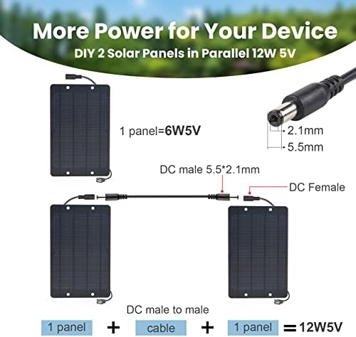 - DIY 2 paneles solares en Paralelo 12W5V: conecte 2 paneles solares con un cable DC-DC, la potencia será de 12W. Más potencia para su dispositivo.