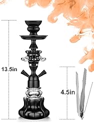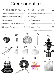 14'' Hight Glass Base Little Hookah Complete Set. HOOKAH WITH EVERYTHING: The package includes 1 hookah glass base, 2 hoses, 1 center pole with glass accessories, 1 downrod, 1 ash tray, 1 ceramic bowl, aluminum foil, disposable tips, all hookah grommet, and 1 clip. EASY TO ASSEMBLE: You only need 1 minute to set up our hookah very easily, the convenient hookah construction is a good companion for you on the go. SHAREABLE 2 HOSE HOOKAH: Compared to the traditional 1hose hookah, this hookah is upgraded to 2hose, which can be used by 2 people at the same time and has big cloud to share it with your friends. BEST GIFT: Suitable for parties, picnics, camping, bars, whether you are a beginner or a hookah lovers, this hookah is the perfect choice, fashionable shape and design, big clouds, bring you great fun. 100% RISK-FREE PURCHASE - If there is any problem with your small hookah set, you can contact us for a refund or replacement within 90 days. We offer 24-hour English-speaking online service!