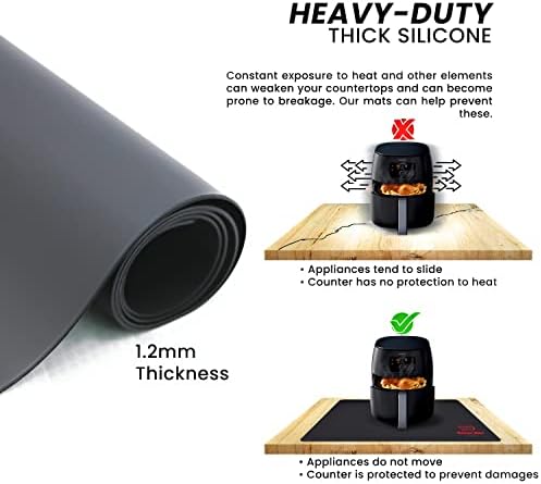 - Large Size: 23"x15"x1.2 mm thick. This large heat resistant mat for countertop gives a lot of room to protect your counters from any kitchen appliances that produce heat, including air fryers, coffee pots, microwaves, instant pots, and more. Also if needed easily cuttable to fit the exact size silicone counter protector mat you need.