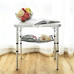OVERALL DIMENSIONS:This picnic table Open size is :24 "(L) x 16 "(W),3 Heights : 10 " to 19 " and 24 " in high with the adjustable legsPack size is 16 "x12 "x3 " when folded in half.A nice compact short table, great for overland camping THOUGHTFUL DESIGN: The small Aluminum table with high-quality MDF top, thicker 25 mm diameter Alloy Frame.5.5 lbs weight,70 lbs weight capacity.All 4 leg extensions have adjustable feet for leveling on the ground or adding an inch of height EXTRA STORAGE:The table itself has a large mesh holder under the table top. This feature allows the table to hold many items, including drinks, snacks, books,utensils, games, phones and 2 S-Hook for holding kitchen tools,keys,ang speakers, bags and more STEADY AND COMPACT: Foldable and liftable outdoor camping table.Quite handy!Can be used for outside camping table for picnics after lifting up ,and table for laptops putting on bed after lowing down.Very steady.Won't shaking CONVENIENT TO USE:Our fold table is easy to assemble and versatile for both indoor and outdoor settings.Whether on the patio, as enjoying coffee at home, camping, picnics,block party,kids artwork,it's ideal for any space and occasion