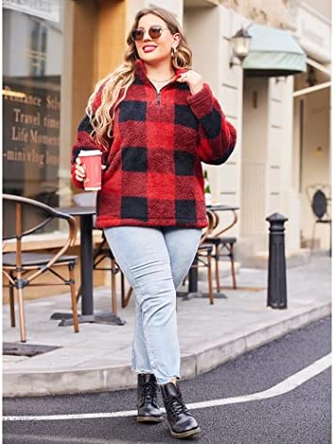 IN'VOLAND Women's Plus Size Plaid Sherpa Pullover Quarter Zip Long Sleeve Fleece Jackets Sweaters Sweatshirts Outwear Coat