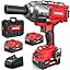 - 【Qué Obtendrá】Llave de impacto inalámbrica de 1/2 pulgada, 1 x batería de 4.0AH, 1 x cargador rápido, 6 x sockets de impacto (17mm, 18mm, 19mm, 20mm, 21mm, 22mm), 3 x barras de extensión (3-in, 5-in, 10-in) y 1 x maleta. Comience a trabajar de inmediato sin costo o tiempo extra que perder