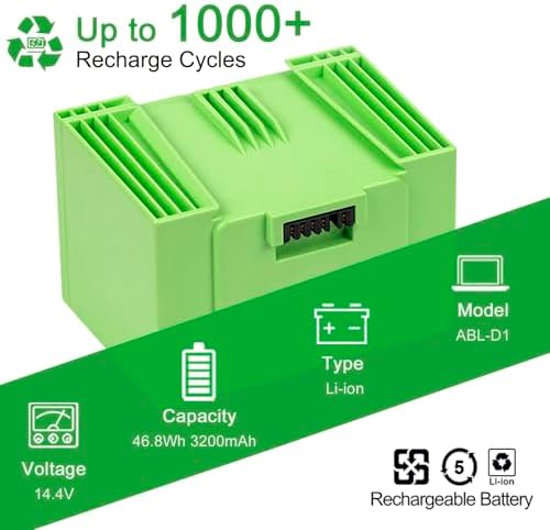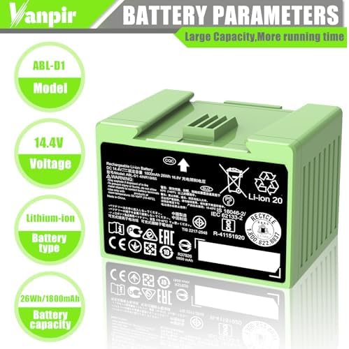 - 🔋【Specifications】 Battery Model: ABL-D1. Battery type: Li-ion. Voltage:14.4V. Capacity:1800mAh/26Wh. 100% Compatible with iRobot Roomba i & e Series. Replacement Parts for iRobot Roomba j7 j7+ i7 i7+ i4 i8 e5 e6