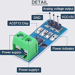 - Product parameters: 1.Current sensor chip ACS712ELC-20A 2.Pin 5V power supply, onboard power indicator 3.The module can measure positive and negative 20A current, corresponding to analog output 100mv/A 4.When no detection current flows, the output voltage is VCC/2 5.PCB board size: 32x14mm/1.26x0.55in Note: ACS712 is based on the principle of Hall detection, please try to avoid the influence of magnetic field when using it! Package includes: 5 x ACS712 20A Range Current Sensor Module 1 x 15Pin Female to Male Dupont Cable