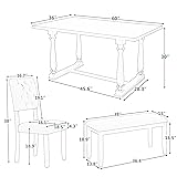 [Superior Quality Wooden Dining Table Set] - This tableware leg is made of high-quality Melaleuca material to ensure a long service life. The table top is made of thick planks to enhance the bearing capacity, and it is also equipped with wear-resistant veneers to prevent wear and erosion in daily use. The bottom of the table has a large contact surface with the ground, which helps to protect the floor. [Family Dining Room Set for 6 People] - This set of tableware includes 1 table, 4 matching chairs and 1 bench. The design is practical and compact, which can comfortably fit into your space and fully accommodate you and your family. The design takes into account the sense of use and comfort. The spacious desktop is conducive to your placement of fruit bowls, vases, candles, etc., and it won't be crowded. [Retro Style Kitchen Dining Table Set] - This is a simple set of modern tableware with a stylish retro design and a retro pine veneer on the surface. Simple and neutral design, this set of tableware will be seamlessly added to your restaurant, or perhaps the finishing touch. Accent wood grain details and beige burlap seats perfectly combine this set of furniture, which can add various design aesthetics to your dining room, kitchen area or family bistro. [Excellent Comfort Chairs & Bench] - The backrest and cushion of this wooden chair kit are covered with thick sponge, so that you can enjoy a better sitting experience. The cushion thickness is 60 mm, and the chair back decorated with tufted buttons makes the chair more beautiful. The legs are made of Melaleuca, and the solid wood legs are durable, which ensures the stability of the whole table. [Assembly & Dimensions Dining Table Set] - Easy set up with clear manual instructions included. Follow the instructions step by step, and you can quickly get a complete set of dining tables and chairs. Table Dimensions: 60“L x 36”W x 30”H, chair Dimensions: 16.7“L x 17.7”W x 38”H, bench Dimensions: 38“L x 15”W x 18.9”H. Tabletop weight capacity: 220 lbs; Chair weight capacity: 250 lbs/piece. Package Number: 2.