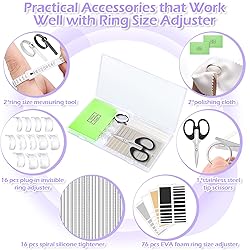 What You Get?: A full set of tools will help you get rid of ring size worries. Set include 8 sizes plug-in invisible ring adjuster, 2 pcs for each size, 16 pcs in total. 4 packs EVA foam ring size adjuster, colors include black, white, gray, yellow. 4 sizes spiral silicone tightener, 4 pcs for each size, 16 pcs in total. 2 ring size measuring tool, 2 polishing cloth, 1 stainless steel tip scissors. Fits Most Rings: Fits ring widths from 1mm to 10mm, suitable for women's rings and men's rings (even wide men's rings). This ring size adjuster is specially designed to hold your ring. Invisible - Fully Integrated Into Your Ring: This silicone ring adjuster is completely transparent when you use it, no one will notice it unless you show it to others. With it, you don't need to worry about the size of the ring. You just need to pick the right size and it will be like a part of your ring, holding the ring firmly on your finger, you won't even feel it. Softer To Your Skin and Rings: High-quality TPU silicone always gives you a better feeling, it is suitable for rings of various materials, and also accommodates a variety of different skins. The unique properties of TPU silicone make it painless and odorless, without irritating fingers, and comfortable to wear(It is not recommended to wear too tight, please keep ventilated, especially in hot and stuffy environments). Similarly, you also don't have to worry about it scratching your ring. Don't Take It Off, Wear It Forever: this ring adjuster is waterproof, it's waterproof! When your ring fits perfectly, you never have to worry about losing it again in everyday life. Do What you want to do, laundry, cooking, pot plants, or all kinds of outdoor sports, your ring won't go anywhere!