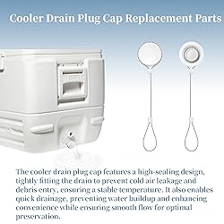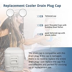 Fits Igloo 50-165 Qt Coolers,Replaces Part #20049 The upgraded cooler drain plug cap comes with a durable stainless steel tether that prevents the cap from being lost. The threaded design ensures a tight seal to prevent leakage FULL KIT SET: Threaded Drain Plug Caps With Stainless steel Tether, Set of 2. Easily installed on existing drain plug. EASY TO INSTALL:You can easily replace the threaded drain plug cap in a damaged cooler. The high compatibility of these parts allows you to use them quickly and install them quickly, without cumbersome purchases, and you can keep them as spares. DURABLE AND RELIABLE:The cooler drain plug cap replacement parts are made from durable, high-quality materials and have been thoroughly tested by the manufacturer to ensure long-lasting and effective performance