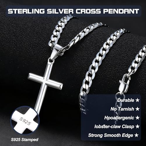 Besteel 925 Sterling Silver Cross Necklace Beveled Edge for Men Women 5mm Stainless Steel Non Tarnish Durable Cuban Link Curb Chain Crucifix Pendant Necklace Jewelry 16-30 Inches