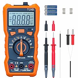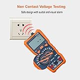 🎁【FULL FUNCTIONS】The T21D electrical multimeter accurately measure Non-contact voltage testing, AC/DC voltage, current, resistance, continuity, frequency, capacitance, diode, temperature, live wire test and battery test. 🎁【WIDE APPLICATIONS】This digital multimeter is a useful tool for general electrical testing of power outlets, batteries, charging systems, electrical circuits testing and electronics systems in cars etc. It is a perfect tool for DIYers, homeowners, handymen and electricians. 🎁【AUTO-RANGING MEASURE 】Auto-ranging multimeter is a very convenient tool to use as you no longer have to set your dial based on a range. It will automatically detect the range if you are not testing above the maximum voltage. T21D is a user-friendly multimeter designed to make your work easier. 🎁【NON-CONTACT VOLTAGE TEST】 The T21D Multimeter is also designed with safety in mind. It features non-contact voltage testing and lives function with sound and light alarms. It works for outlets, sockets, and terminals without touching any wires, making the T21D much safer and more reliable to work with. 🎁【6000 COUNTS TRUE RMS ACCURATELY DISPLAY】 Upgraded high accuracy chip and TRUE RMS (root mean square), provide a higher range and more accurate reading, this makes the T21D digital multimeter an excellent tool for electrical testing. 🎁【DOUBLE SAFETY PROTECTION】 The multi-tester has passed overvoltage category III 600V safety standards, anti-Burn with a double ceramic fuse and thermistor protection circuit. The double ceramic fuse provides overload protection on all ranges effectively. 🎁【USER-FRIENDLY DESIGN】Convenient features like Data Hold, Large LCD screen with backlight, support stand, test leads holder, and flashlight function makes taking and recording measurements easier than ever before. 🎁【DURABLE & PROTECTIVE ORANGE SHELL】 The outer layer of the digital multimeter is wrapped with a sturdy and Non Slip silicone protective cover, will help with drop protection and more durable. 🎁【PACKING LIST】1x Electrical Multimeter , 1x probe test leads, 1x Thermocouple, 2x Safety tubes, 3xAAA batteries, 1X User manual 🎁【EXCELLENT SERVICE】We provide 30 days manufacturer’s guarantee and lifetime customer support for customer’s satisfaction, if any question, please feel free to contact us, we would give you reply within 24 hours.