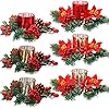 Set of 12 Pinecone Berry Poinsettia Candle Rings with 6 Glass Tealight Holders for Christmas Centerpiece Table Decor