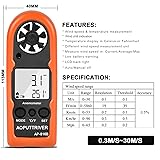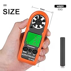Mini Anemometer:Accurately measuring wind speed 0.3-30m/s (+/-5% of rdg ), resolution 0.1m/s; 0.2℃, temperature -10℃-45℃ (+/-2℃) and wind chill and real time measurement Multi-Purpose Digital Anemometer:AP-816B wind speed meter can be used not only for outdoor activities, like shooting, sailing, mountain climbing measurement, but also used for electrical equipment testing, like HVAC appliances and research measurement from navigation to aerial survey Multi-Mode Wind Speed meter:Measure wind speed,wind chill indication,wind temperature; The backlight screen makes it easier to read in dark conditions More Intelligent & Portable:Compact and Lightweight, Easy to Carry; Auto/ Manual Power Off; ℃/℉, Wind speed unit select m/s,Ft/min,Knots,Km/hr,Mph, High Precision Pressure Sensor Customer Service Guarantee:3V(CR2032)*1 Battery (Included), low battery indicator with auto power off functions. Also 2 years technical support. If you have any product problems, please let me kno