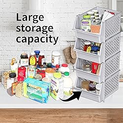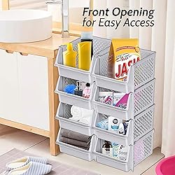 [Organize with Ease and See Everything at a Glance] No more digging through clutter. These stackable open front storage bins for toy storage or closet organizer let you instantly spot and grab what you need, thanks to their clear, open-front design. Perfect for food, toys, toiletries, and more. Set of 4. Single bin size: 11.5"L x 14.5"W x 7"H [Save Space and Declutter Any Room] Whether in the garage, kitchen, or kids’ room, these stacking storage bins open front or storage drawers help you maximize vertical space without taking over the floor. Nestable when not in use to free up even more storage. [Access Items Quickly Without Unstacking] Designed for convenience, these plastic storage bins allow easy reach to contents at any level, no need to lift the bin on top just to grab what’s inside. [Keep Contents Fresh with Ventilated Sides] The breathable mesh design of these organizer bins and plastic drawers ensures airflow to prevent moisture buildup, keeping toys, food, and supplies clean and dry. [Strong, Stable, and Made to Last] Built from durable plastic, these large stackable storage drawers open front can handle heavy items without warping or tipping over, perfect for everything from pantry goods to garage tools.