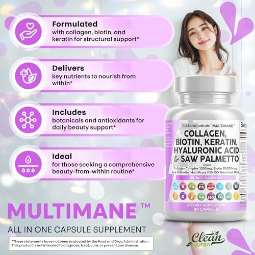 - Vitaminas Todo en Uno para Cabello y Uñas - MultiMane está repleto de potente colágeno tipo 2, píldoras de péptidos de colágeno, píldoras de biotina para el crecimiento del cabello y más vitaminas para el cabello para mujeres. Limpia esos innumerables suplementos para el crecimiento del cabello en tu gabinete de suplementos y reemplázalos con una sola porción simple de cápsulas de colágeno para mujeres y píldoras de colágeno para hombres usando esta fórmula 16-en-1 de Clean Nutraceuticals. Disfruta de colágeno de calidad para la piel tomando péptidos de colágeno múltiple.