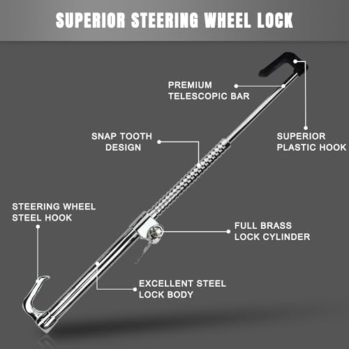 - Adaptable: The steering lock's 3 section telescopic design can be retracted in accordance with the height of the clutch or throttle.The steering wheel lock is adjustable with a range of 20.3-29 inches from the pedals to the steering wheel and it’s fit for cars, trucks, vans, suvs etc