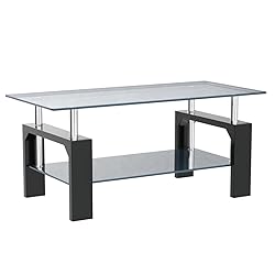 Btrpily Living Room Rectangle Coffee Table, Tea Table Suitable for Waiting Room, Modern Side Coffee Table with Wooden Leg, Glass Tabletop with Lower Shelf, 39.5D x 23.5W x 17.5H in, Black