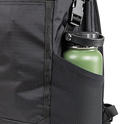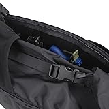 Roll-top with zipper closure Quick side access with zipper closure Loop lining for hook backed accessories Adjustable shoulder strap Exterior zipper pocket