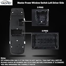 - Notes:FIT 3PINS +0 PIN ONLY! IF THE PINS DO NOT MATCH, THIS PART WILL NOT FIT. PLEASE CHECK OE NUMBER AND PLUG PINS BEFORE PURCHASE IT!PURCHASE ATTENTION: There are multiple versions of this kind of switch with same look. Please compare the plug configuration of original switch with pictures to ensure you are ordering the correct part!Replace OEM Part Number: 68110871AA,68298871AA,56046568AC, 04602535AI, DWS1842, 901489Compatible with:For Chrysler Town & Country 2012 2013 2014 2015 2016 V6 3.6L Mini Passenger Van Power Window SwitchFor Dodge Grand Caravan 2012 2013 2014 2015 2016 2017 2018 2019 V6 3.6L Mini Passenger Van Power Window SwitchFor Ram C/V 2012 2013 2014 2015 V6 3.6L Mini Passenger Van Power Window SwitchFeatures:Terminal Quantity: 3 Pins+ 0 PinPosition: Left Driver SideRated Voltage: 12 Villumination Type: Blue LightMaterial: ABS Plastic.Package Included: 1x Master Power Window Switch Front Left Driver Side (3 Pins+ 0 Pin)
