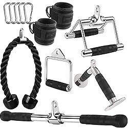 💪【Lat Pulldown Attachments Set】: Includes:1x Tricep Rope, 1x Double D Handle, 1x V-Shaped Bar, 1x Straight Rotating Bar, 1x Single D Handle,2x Ankle Straps and 5 x Snap Hooks . These home gym accessories for men and women are designed to fit most cable systems. 💪【With Grip Lat Pull Down Bar】:Our rubber handle with efficient Grip design on both sides has a balanced curvature that creates feeling of solid grip, prevent slipping during workout even with sweaty hands.It can better exercise your grip, shoulders, and back. 💪【TOP PROCESS & MATERIALS 】- Cable machine attachment constructed of high-quality solid steel with polished chrome finish. 0.6 inch hole can fit easily for all cable system. Textured rubber coating handle,provides ergonomic & secured grip during workout, provides a balanced force to both arms when attach it to any gym machine. 💪【MULTI WORKOUTS】-Tricep pull down attachment perfect for building stronger triceps and grip strength, assisting muscles around elbows, wrists, back, abs and shoulders with different compound pushing exercises: triceps pushdowns, seated cable rows, straight bar cable pressdown, seated upright rows, perfect for both workout at home and gym. 💪【ALL LEVEL APPLIED】: LAT Pull Down Attachment can be used for all gym levels, from beginner to professional,this exercise equipment will help you focus on the target muscle groups rather than putting unnecessary stress on the joints.If any questions, our order support the all-the-way tracking service on amazon. We guarantee fast customer service and only wish our customers satisfaction.