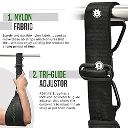 - Elevate your core training with the RDX Ab Sling, a durable and comfortable workout companion designed for enduring performance. Crafted from tough Maya Hide leather, these ab straps ensure longevity and support intense ab workouts with their continuous single-stitched strap design. The double powder-coated D-rings and carabiner clips guarantee a secure attachment to any bar, offering universal compatibility with various gym setups. The 6mm inner neoprene padding provides comfort during extended ab training, while the grip jacket combats fatigue, ensuring a firm hold for sustained focus. With its convenient tri-glide adjuster, the RDX Ab Sling allows for easy customization, making it the ultimate tool for achieving a rock-solid core, whether you're at the gym or home.