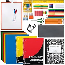60 PIECE SETS: Bulk school supplies packs each contain everything your K-12 students need to get organized & start the school year off right WHAT’S INCLUDED: Every pack comes with 2 One Subject Spiral Notebooks [Wide Ruled], 1 Composition Book, 5 Two-Pocket Organizer Folders, 1 Zip Top Canvas Pencil Case, 1 standard & metric 12-inch ruler, 1 Scissor (For Righties & Lefties), 6 #2 Pencils, 3 Pencil Top Erasers, 5 Ballpoint Ink Pens, 5 Colored Pencils, 5 Markers, 1 Dry Erase Board, 3 Dry Erase Markers, 1 Pack of Crayons, 1 Pencil Sharpener with Dome Lid, 2 Easy Twist-Up Glue Sticks, 3 Highlighters, 4 Pink Erasers, & 1 Pair of Black Earbuds SCHOOL SUPPLIES VALUE PACK: Why shop & pay separately for 1 of every essential for your kids when you can get them all in 1 convenient packaged set? SAFE & USEFUL: Products are safety tested, fully compliant, & made for kids! All markers & highlighters are water-based, pencil sharpener’s blade is retracted, scissors are made for little hands and have a blunt safety tip, “lead” pencils are graphite, the glue sticks are washable from clothes & skin, ink pens have perforated cap, erasers are latex-free and low-dust. All items have been made with kids’ needs & abilities in mind PERFECT FOR TEACHERS & PARENTS: Whether your child is homeschooled or goes off to a physical classroom or summer camp, this school supply pack is ideally suited to meet their needs as they grow & learn and will serve them all year long for any subject