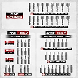 Screwdriver Bits Set includes 138 pieces 0.98" bits, 29 piece 1.97" bits, 18 piece 2.95" Bits, 1 piece quick release bit holder, 1 piece bit holder and 1 piece adapter. Master 208 Piece Screwdriver Bit Set includes bits with Phillips, Slotted, Torx, Square and Hex drive, nut drivers and scrurity bits with tri-wing, spanner, torq, clutch, spline, tampter proof torx, tamper proof hex drive in a variety of sizes for total coverage. The screwdriver bits are constructed with 6150 high-grade carbon steel with a sandblasted finish for maximum rust and corrosion protection and reduces wear outs to ensure longevity and durability. Each piece in this master bit set is finely crafted and precisely machined for accurate size. The chamfered bit ends insert smoothly into fasteners and protect both the bits and the fasteners from damaged edges. This screwdriver bit set features convenient bit adapters for ease of use with electric screwdrivers, screwdrivers, hand drills and pneumatic tools. Use them for home or work projects wherever extra security is a must.