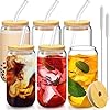 - [PLACER DE BEBER MEJORADO] El juego de vasos de vidrio incluye 6 vasos de vidrio con forma de lata, 6 tapas de bambú, 6 pajitas de vidrio y 2 cepillos de limpieza. Diseñado con los contornos suaves y agradables de una lata de aluminio similar a la tradicional, es sin duda el recipiente ideal para café helado, cerveza, cócteles, té con leche, refrescos, zumo y cualquier bebida que se te ocurra.
