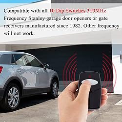 - 10 Dip Switch Style 310mhz Visor Clip Remote for Stanley 310MHz 10 Dip Switch ReceiverIMPORTANT NOTE: This remote only compatible with Stanley, Multi-Code, Heddolf, Digi-Code garage receivers features 10 dip switch, 310MHZ frequency. Other brand, frequency and dip switch will not work.Only compatible with the following models on 310MHz 10 Dip Switches:Stanley: 1038, 1040, 1044, 1047, 1049, 1050, 1076, 1079, 1082, 1100, 24911, 51-4271, 51-4272, 51-4273, 51-4369, 51-4726, 105015, 308302, 108210, 109410, 109710, 308913, 1050-TDigi-Code: 5012, 5062, 5032, 5042, 5072Heddolf: S219, S220Program with your 310 MHz Stanley Receiver:SELECTING A CODEYou may set your transmitter to any code you desire but be sure that the code you set matches the code that has been set on your radio receiver. The digital code is determined by the positions of the 10 small switches numbered 1 through 10 located in the receiver and transmitter. Any combination of ON (CLOSED) or OFF (OPEN) positions can be selected by using a small screwdriver or ball point pen.Set our remote on the same position on your original transmitter or receiver DIP switch position.TIPS: Normally, you only need to set the DIP Switches of our remote control to the same position as your original remote control, from "1" to "10". If this doesn't work, please try to set it to the opposite position to your original remote control. Because original remote or receiver may use the different dip switch.For example, if the your original remote control or receiver at switch "1" is "ON", then set our remote control to "OFF" (the side next to the number), and so on, until all 10 DIP Switches are set. Product Details:Frequency: 310 MHz10 position dip switch visor clip remoteProgram with Stanley receivers and transmittersMaterial: ABS Plastic, Black CaseBattery Type: 12V 23A Alkaline Battery