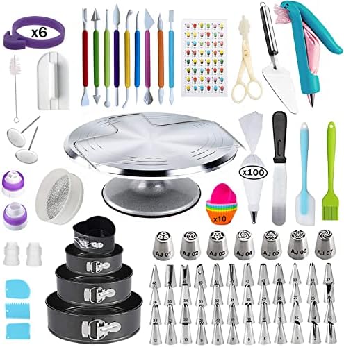 All the cookie decorating supplies meet Food-Grade standards, baking utensils made of high quality food-grade 304 Stainless Steel, silicone and plastic. Sturdy and reusable, safe for family cake making. It’s good cake decorating tools for adult and kids. cake decorating supplies Professional cake decorating supplies set Colors make us free and beautiful. With 204 pcs cake decorating baking accessories you will have the best possible to create your own design. Feel free with your creativity. Unlike the average cake tools made of flimsy plastic and thin metal, the Cake Decorating Kit is made of rust-proof stainless steel and sturdy, BPA-free silicone, Dishwasher safe! Our decorating nozzles are the colorfully on the market, and Piping Tips are numbered to match our Decorating Piping Chart. 4pcs springform pans sets can work perfectly in a pressure cooker of 6Qt or 8Qt, so you can also make different sizes or layers of cake according to your needs. Rotates 360 degrees non-slip base cake turntable allows you easily to decorate cakes, ideal for icing, combing, borders, levelling etc. There are detailed instructions for use in our products. Don’t worry about not know using them.