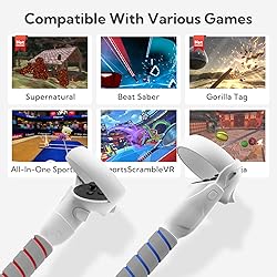 Enhance VR gaming experience: This ZYBER Handle Accessories is specially for oculus quest 2 controllers. When you hold it, you will feel like your actually holding the sabers and get a better experience while playing Beat Saber, Gorilla Tag, Supernatural,First Person Tennis,Vader Immortal, etc. Patented Quick-lock Buckle Design: With quick-lock buckle design , this vr quest 2 beat saber handle is easy to set up and securely fastened. No more worry about the controller will shake or fall to the ground while playing the game. ABS Reinforced Plastic Shell: The part of connect Beat Saber Handle and controllers is made of premium reinforced ABS plastic which is strong and durable. Perfectly compatible with quest 2 controllers. Lightweight and Comfortable Grips: High quality and soft sponge add more comfort to this handle extension, easy to hold and non-slip.It provides players with a more realistic VR gaming experience such as Beat Saber, Fruit Ninja, Golf+, etc. Avoid Dropping: To avoid the controllers will fly out during intense VR gaming, we enhances the strength of the protective rope. Now the protective rope can hold weight up to 10lb. What You Will Get :2 x ZYBER Handles Extension Grip for quest 2, 2 x Quick-lock Buckles, 2 x Protective Ropes.