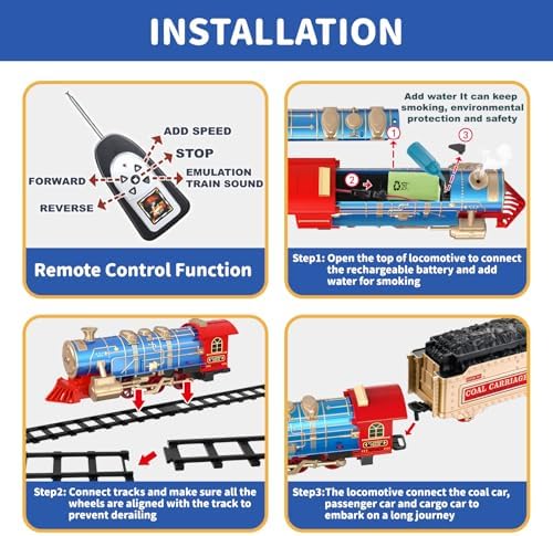 - Complete Train Set Accessories: Includes locomotive engine, passenger car, coal car, wagon, 12 curved tracks, 4 straight tracks, cross-type fork track, 8 traffic signs, 2 trees, kettle, remote control, rechargeable battery, and USB cable