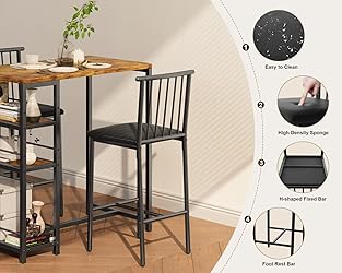 Space-Savvy Design: Our bar table and chairs set features a sleek bar table paired with two stylish chairs, all designed to maximize your space. With three deep storage shelves cleverly integrated into the design, you’ll have plenty of room for drinks, snacks, or decor. Plus, the chairs easily tuck under the table when not in use Built to Last: Crafted from durable MDF boards with a chic laminated wood grain finish, this set combines style and practicality. It’s easy to clean and stands up to everyday wear and tear. The sturdy powder-coated steel frame ensures lasting stability and durability Comfort Meets Chic: Enjoy a cozy dining experience with our chairs, featuring high-quality PU leather, a high-density sponge cushion, and ergonomic curved backrests. Perfect for long meals or casual hangouts Versatile & Functional: Whether you’re in the kitchen, living room, dining area, patio, or office, this bar table set fits right in. It’s perfect for a pub-style dinner, a casual breakfast bar, a coffee station, or even a homework desk—adapt it to your lifestyle Hassle-Free Assembly: Putting it all together is a snap! With clear instructions and all necessary tools included, you can set it up in just 30 minutes. Have questions or suggestions? The Gizoon Team is just a message away, ready to help