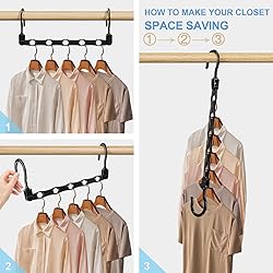 - 24 Pack Magic Hangers Space Saving Closet Organizers and Storage, College Dorm Room Essentials, Multifunctional Clothes Hanger Organizer Plastic Closet Organization Space Saver for Wardrobe Maximize your closet space! Keep your hangers neat and organized! College dorm room essentials for students girls! About Product Include 24 Pack Magic Hangers Space Saving Specification Color : Black Material: Plastic Magic Hangers Space Saving Each magic hanger organizer has 5 enclosed holes slots to effectively prevent the clothes hangers from falling. The collapsible hangers hook can be rotated 360° freely, suitable for all kinds of closet rods, convenient for you to hang clothes as you wish! Hanger Organizer for Closet Two Usage Modes Hanger organizer supports two types of hanging. Vertical mode: Saving more than 80% space for your closet. Horizontal mode: Convenient to pick up and place/dry clothes. You can choose the right hanging method for the space saving hangers according to your closet to help you make the most of your closet space.