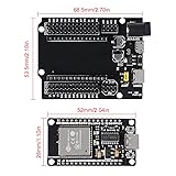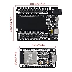 - Development board model: ESP32-DevKitC-32Module model: ESP32-WROOM-32Main control chip: ESP32-DOWDQ6-V3 dual-core 32bit MCU integrated WiFi, Bluetooth,Integrated 520-kBSRAM, 448-kBROM16-kBSRAMinRTCExternal storage: 4MBUSB driver chip: CH340C, with good system compatibility, higher download speed, and more stability. Support VIN external wide voltage input 5-12V power supply (battery version maximum 5.5V input) Support USB power supply, external 3.3V power supply, and VIN power supply three kinds of power supply Mode development board size: 52*28mmweight about 9.5gCompatible with ArduinoIDE mixly, mind+, Python and other programming software Package: 2 PCS ESP32 Type-C USB Development Board 2pcs Expansion Board