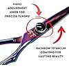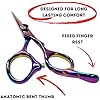- **Acabado de Titanio Arcoíris**: Nuestras tijeras profesionales presumen de un impresionante acabado de titanio arcoíris que no solo se ve elegante sino que también añade extra durabilidad a tus tijeras de corte.