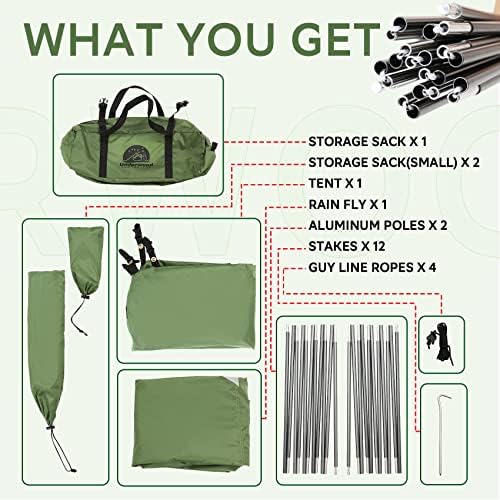 - UPGRADED MATERIALS: The backpack tent is designed with premium materials to be used in all weathers of the year. Includes sturdy aircraft grade aluminum poles and full cover rain fly for winter temperatures. The aluminum poles of the waterproof tent are light and tough. The rain fly design and PU5000mm coating of the cold weather tent make sure the interior is dry and clean. All these make the small camping tent windproof and waterproof