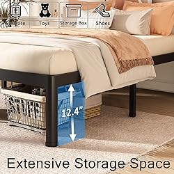 Heavy Duty Bed Frame:The bed frame full size is made of heavy duty steel,strong enough to withstand 3500 lbs,the full bed frame is no squeak and comes with anti-scratch gaskets to protect your floor Safety Design:The platform bed frame full is designed with rounded corners prevent injuries caused by toe bumps.Quiet and anti-slip design for bed legs while avoiding the floor being scratched No Box Spring Needed:The full bed frame with storage, durable steel slats support and extend the life of your latex, memory foam or innerspring mattress Storage Space:The metal bed frame full with 12 inches of bed storage to store more debris, and makes your room look more cleaner and tidier Easy Assembly:The full size platform bed frame is very quick and simple to assemble,all the tools are packaged in the box 4 PCS Non Slip Mattress Gaskets:Mattress holder in place with 4 pcs non slip mattress protection baffles for Twin to California King sizes