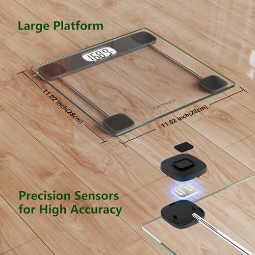 - Product Size and Capacity: This scale has a large platform 11.02" x 11.02"/28cm x 28cm to provide a comfortable touch when you step on the scale; It's made with 6mm tempered glass, lightweight and sturdy enough to hold up to 400 pound/ 180 kg;