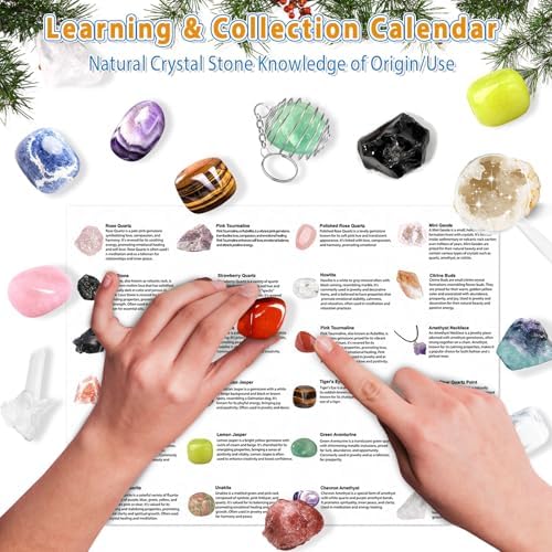 - Descubre la Magia de Navidad con el Calendario de Adviento de Cristal 2024: Embárcate en un viaje mágico esta Navidad con 24 días de sorpresas de cristal, incluyendo piedras crudas, cristales pulidos, ágatas, jaspe,turmalinas, labradoritas, geodas y más. Descubre un collar de Aventurina Verde y un collar de Amatista, perfectos para que los niños exploren las maravillas de la geología o para que los adultos los usen como piezas decorativas o de sanación