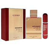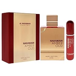 - Step into a world of opulence and sophistication with Al Haramain's Amber Oud Ruby Edition, designed for both men and women. This exquisite Arabian cologne for men and women encapsulates the rich traditions of Arabian perfumery, presenting a fragrance that is both timeless and contemporary. From the very first spritz, this perfume captivates with its top notes of bitter almond and saffron accents, creating a soft and mesmerizing symphony that sets the stage for an unforgettable olfactory journey. As the fragrance evolves, heart notes of Egyptian jasmine and cedarwood emerge, adding depth and complexity. The base notes of ambergris, woody, and musk bring the composition to a compelling finish, enveloping the wearer in an irresistible warmth. Crafted with the finest ingredients, this long lasting perfume for women and men is perfect for those who seek a fragrance that endures. Whether you are looking for women's perfume or men's cologne, Amber Oud caters to all, making it an ideal choice for any occasion. The elegant bottle embodies the luxurious nature of the fragrance it holds, making it a perfect addition to your collection of women's fragrances or men's fragrances. This perfume is a testament to the art of perfumery. It is an Arabian perfume for men and women that combines ancient traditions with modern elegance.