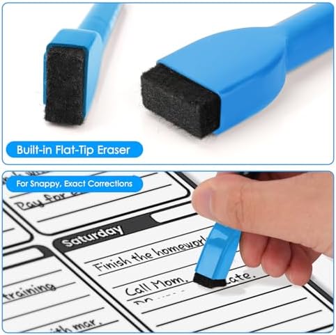 • 1-2mm Precise Lines: The fine point dry erase markers work great for writing clearly, making it easier to fill the days on your calendar board/ whiteboard with more information; The marker with a small eraser can be used directly to erase small mistakes.