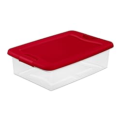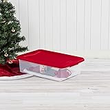 Sterilite 32 Quart Latching Storage Box, Stackable Bin with Latch Lid, Organize Holiday Decor in Home Closet, Clear with Red Lid, 1-Pack