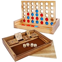 Family Board Games Set: Classic 4 In a Row & Shut the Box are fun for the whole family. These board game set can exercise strategy skills and overall thinking ability, they increases mind thinking and reaction speed as well. Size: Shut the Box - 9.45 x 7 x 1.26 Inch, 4 in a row - 10 x 6.3 x 1.6 Inch High Quality: Crafted from safe and non-toxic, top quality wooden material, smooth surface, neatly cut, without sharp edges. Boards are made from natural wood, Featuring solid blond wood, better and safer than other brands. Inside 12 numbers dice game box is a soft brown flocking cloth and 4 wooden dices. 4 In a Row comes with 21 red discs and 21 blue discs Developing Skills: The Wooden Boards are available to everyone, for social and family entertainment. They helps children cultivate their imagination, hand-eye coordination, creative expression and fine motor skills, make them think independently, great importance for general development, self-confidence and learning Portable Travel Board Game: Our wooden game set, delightful children board games, these two uniquely designed board games provide a convenient place to store pieces, making them safe and in one place. The box is designed with a lid that slides easily and in the right size for easy portability. A great travel game, easy to carry, perfect for indoor and outdoor use easy play for all ages young to adult Great Christmas Gift for Kids: These wooden 4 in a row and shut the box are the fast and smart game, enhancing competition and interactive ability. They are perfect gift for various occasions, such as a Christmas gift, children party gift, birthday gift, classroom teaching, coffee table decor and so on. Attention - Not suitable for children under the age of 3 years. Small parts. Choking hazard